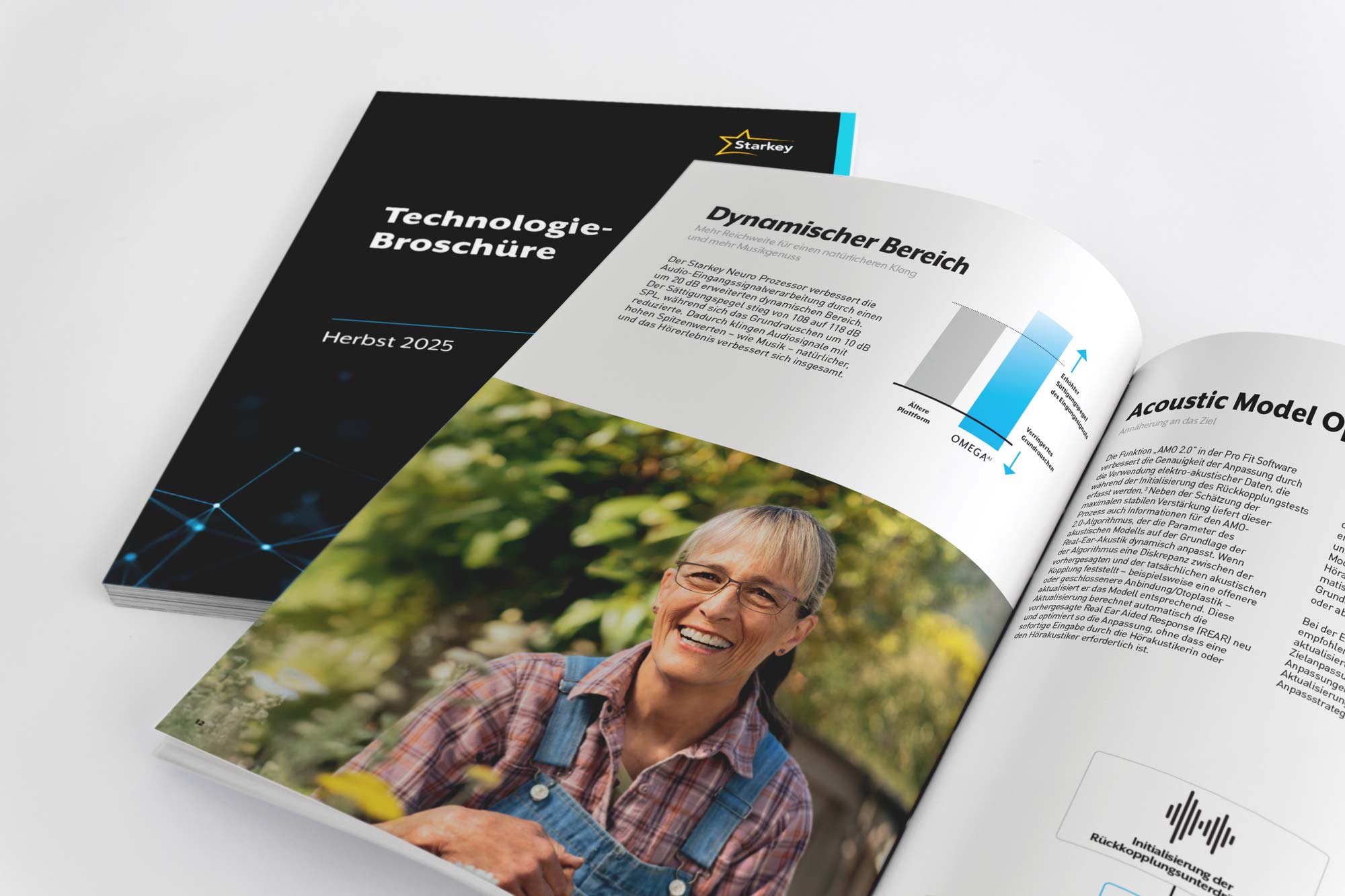 Die Technikbroschüre ist eine Adaption des amerikanischen Originals. Ziel war es, dem Fachhandel zu erklären, welche technischen Features die Starkey Produkte vom Wettbewerb abheben. Dabei mussten die komplexen Inhalte so aufbereitet werden, dass sie im Alltag von AkustikerInnen schnell erfassbar und sicher vermittelbar sind – ohne dabei an fachlicher Tiefe zu verlieren.
